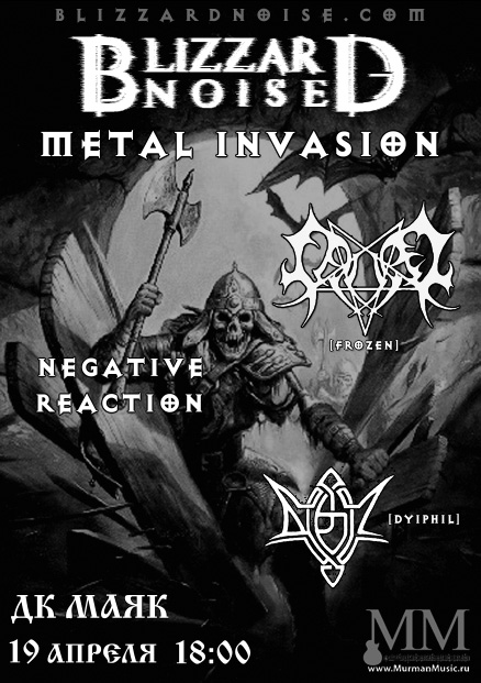 | <КОНЦЕРТ ОТМЕНЕН> 19 апреля в 18:00 на Абрам-мысе, в ДК "Маяк" пройдет концерт Blizzard Noise: Metal Invasion при участии групп: Frozen - Black Metal (Мурманск) Negative Reaction - Metal (Мурманск) Dyiphil - Death Metal (Апатиты) Вход: 150р. Ждем вас!![]() [ обсудить на форуме ]